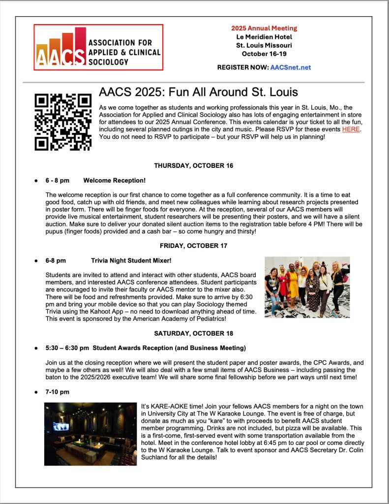 As we come together as students and working professionals this year in St. Louis, Mo., the Association for Applied and Clinical Sociology also has lots of engaging entertainment in store for attendees to our 2025 Annual Conference.